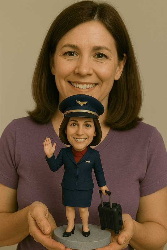Each figurine is crafted based on a photo you provide, capturing facial likeness and signature elements like hairstyle or uniform colors. It’s a one-of-a-kind keepsake that will make them smile every time they see it — whether it’s on a desk, shelf, or airplane jump seat.