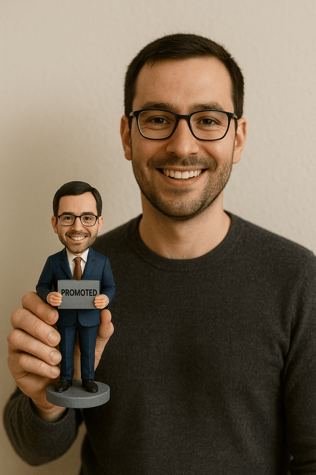 Level up your career milestone with a custom bobblehead that says, "I earned this!" Each figurine is handcrafted to reflect your image, from your confident smile to your favorite professional outfit, capturing that proud moment you stepped up in your career.