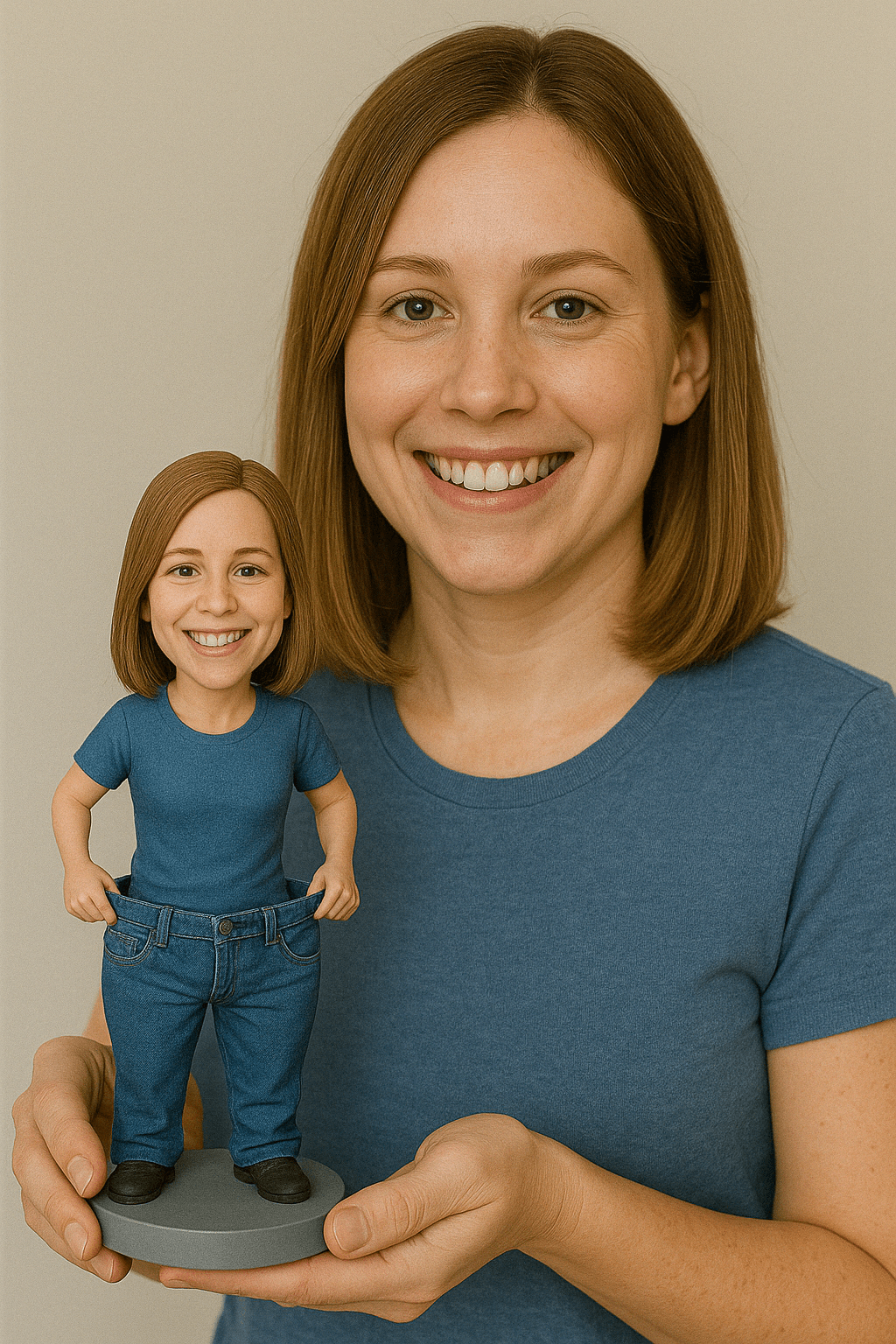 This personalized bobblehead captures the spirit of transformation and dedication. Crafted with oversized jeans and a beaming smile, the figurine holds the waistband wide open — a fun and powerful symbol of progress. Dressed in sporty gymwear and sculpted with care, this custom piece celebrates milestones, motivation, and the story behind every success.