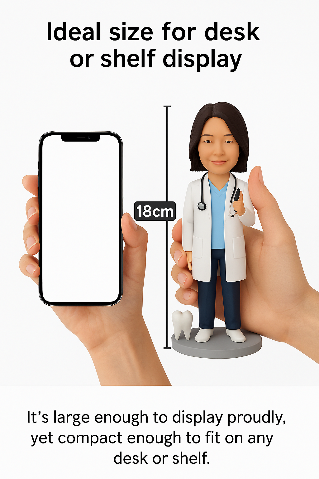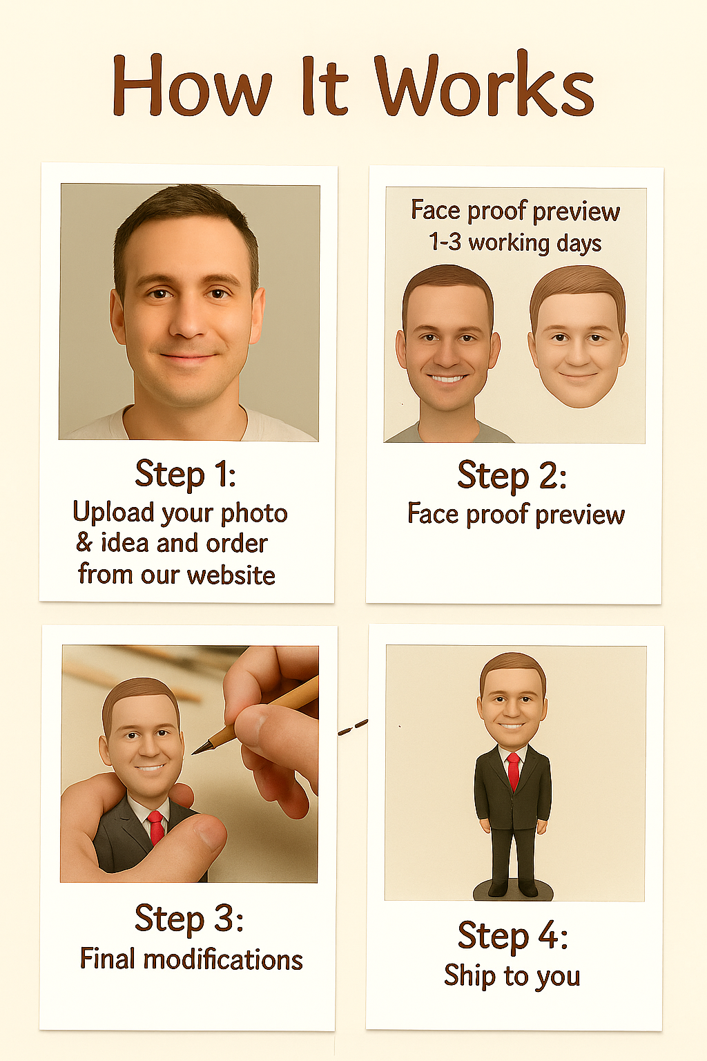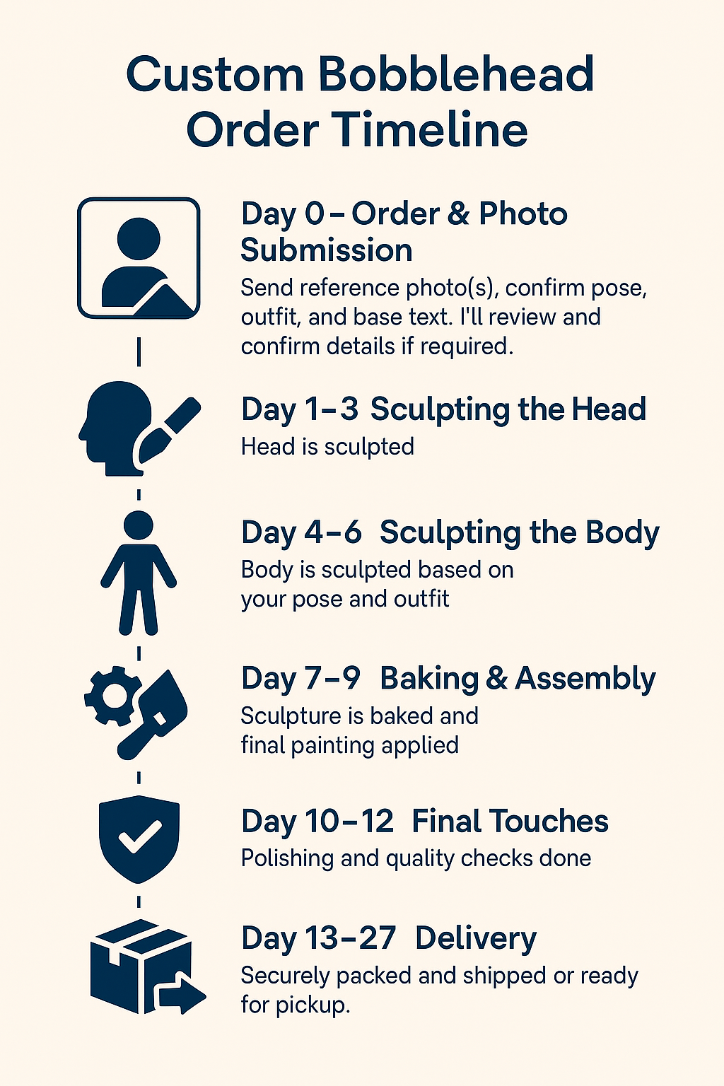 Each bobblehead is handcrafted and typically takes around 1–3 weeks. You’ll get updates (if requested) at each stage: head sculpt, body sculpt, painting, and final approval before shipping.